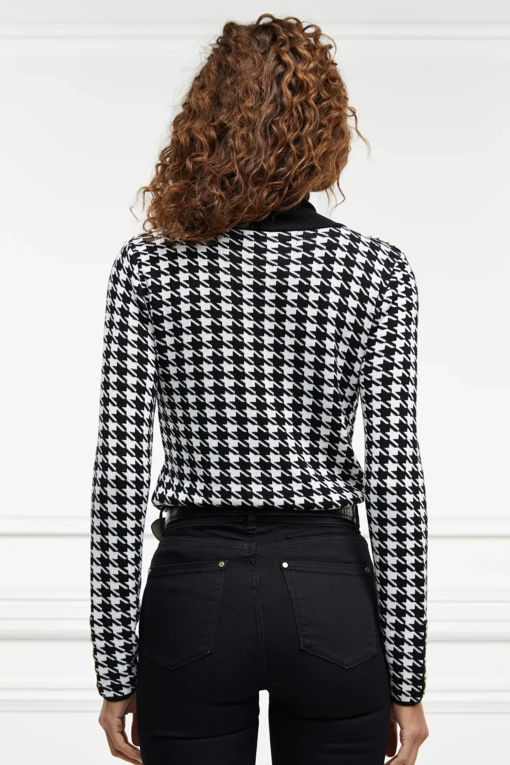 Designed with a slim fit, this ribbed roll neck is made from super soft wool, designed to become an elevated essential for your wardrobe. With a striking classic houndstooth pattern detailed with our iconic gold hardware on the shoulders and cuffs, this knit is perfect paired with our jodhpur jeans for an everyday look.