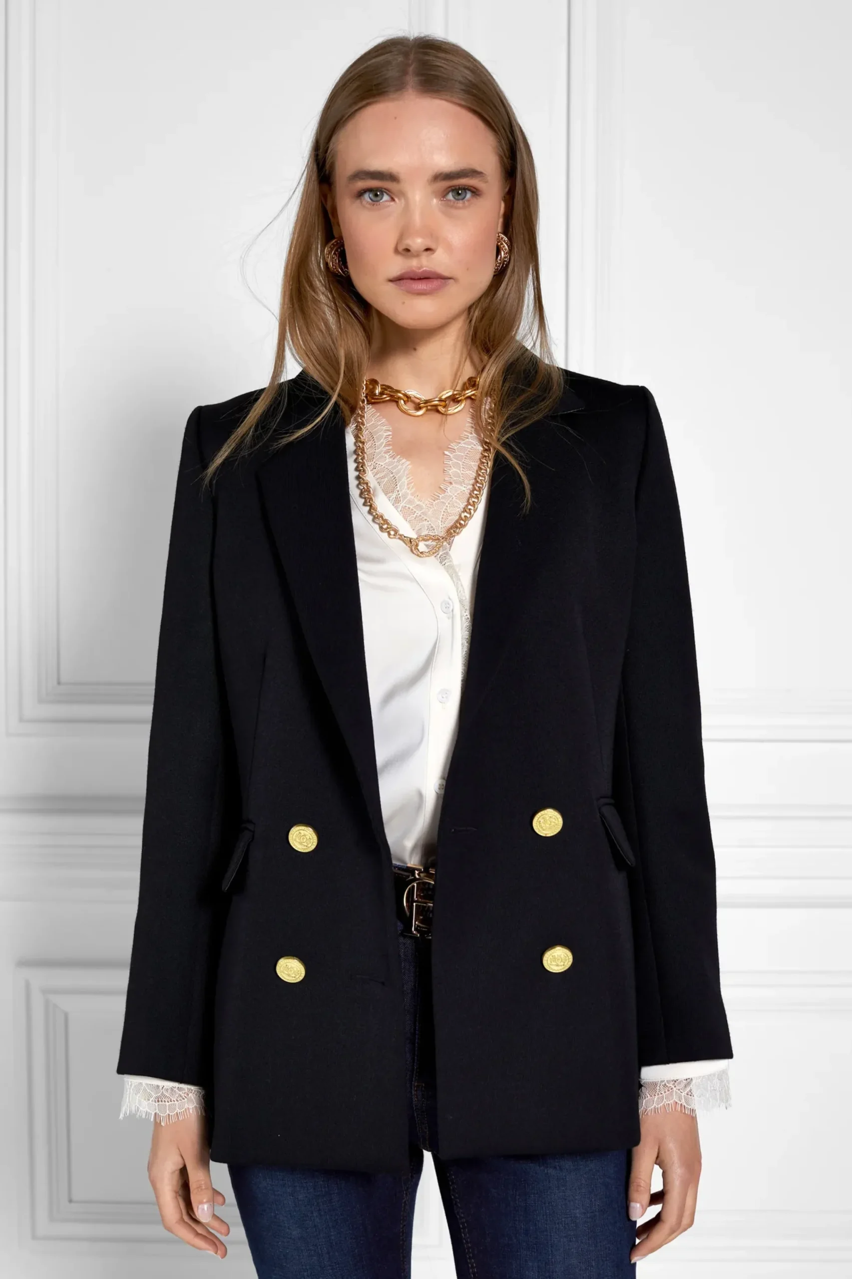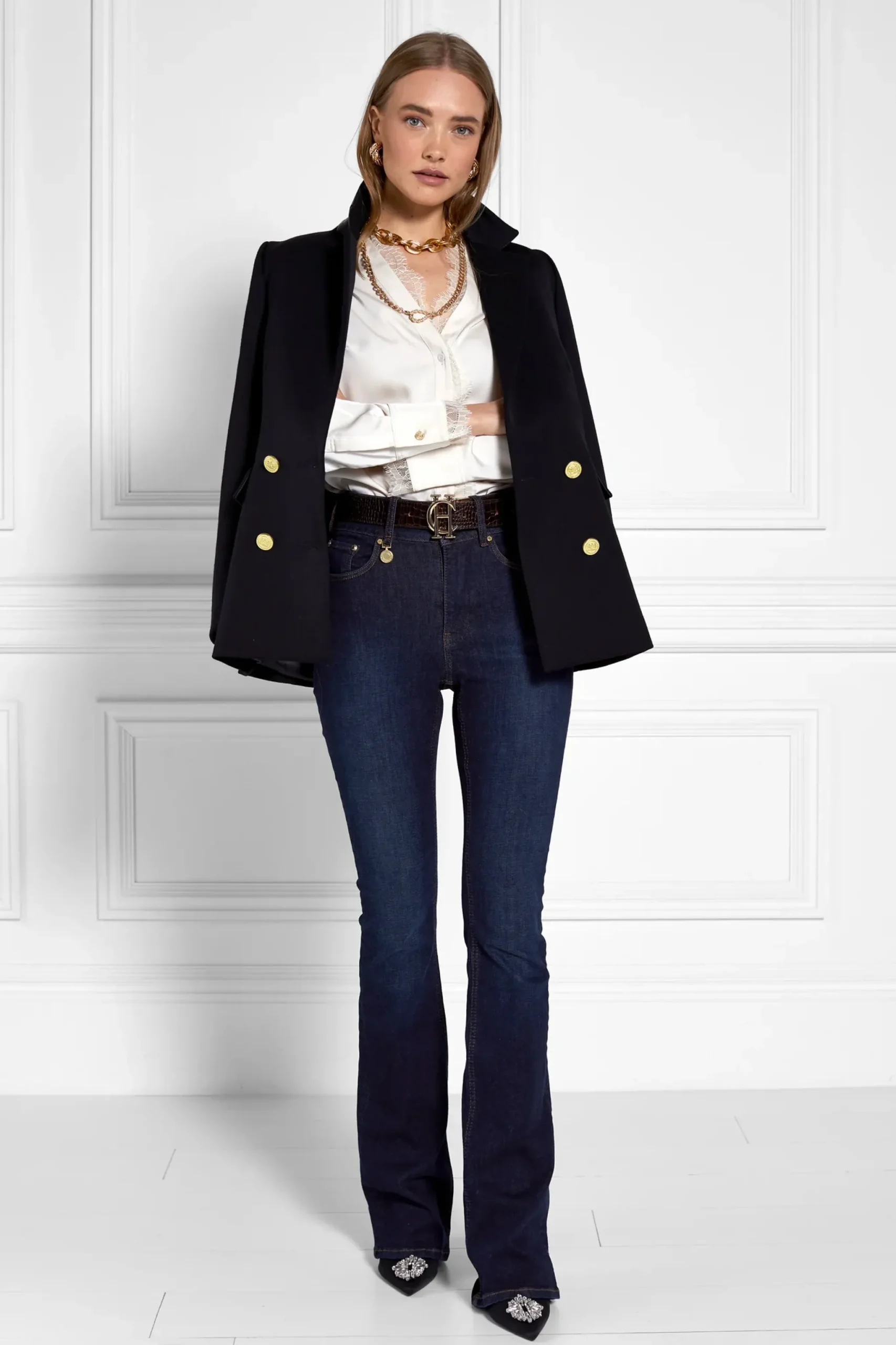 Our beautiful and truly luxurious v-neck blouse has been designed with a relaxed fit. With a delicate lace trim on the collar and cuff edges, this piece is an update of our Lace Tie Shirt.