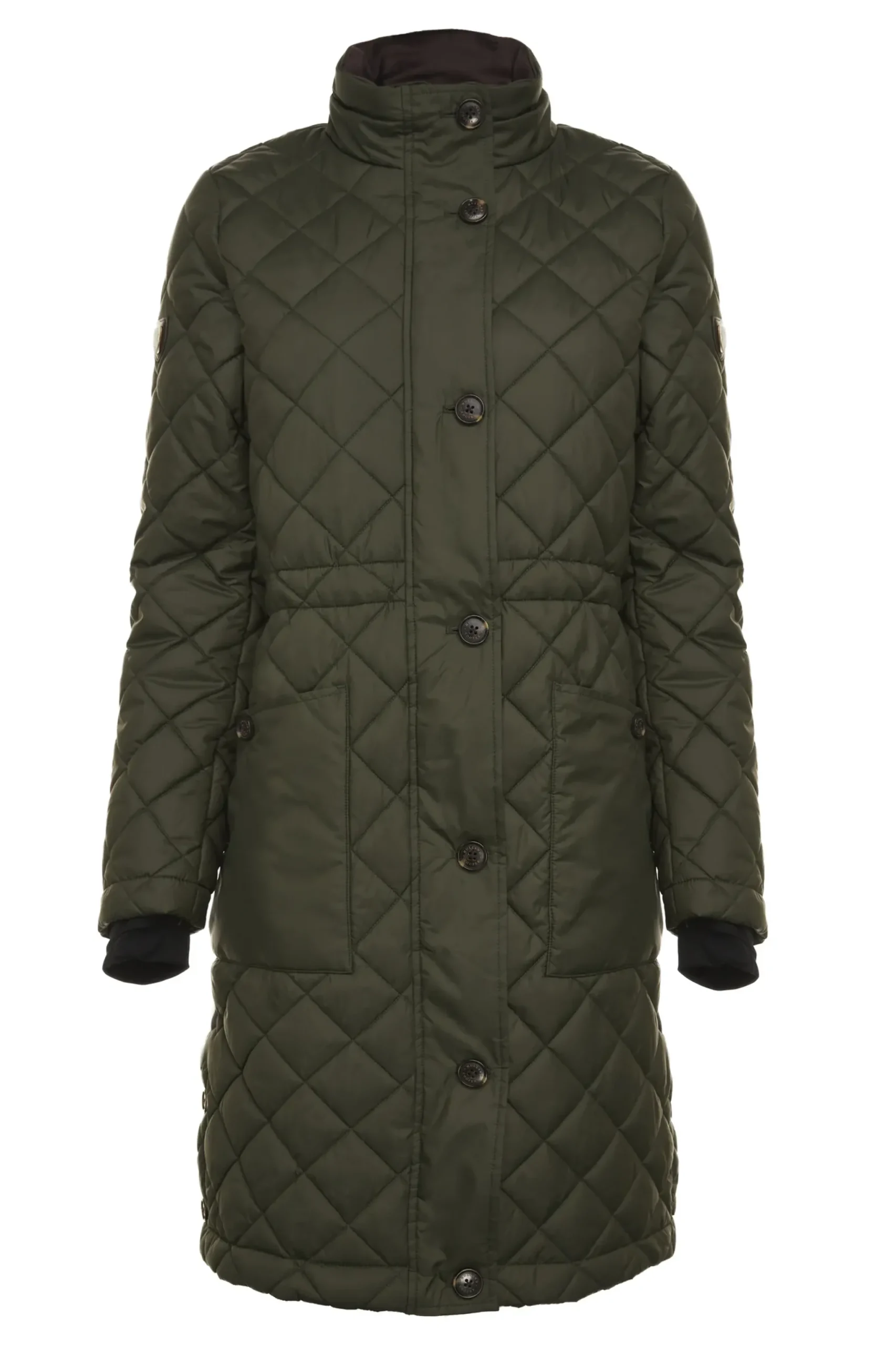 A classic, mid length coat with traditional diamond quilting, lightly filled with our eco down Sorona® fibres. This coat has a storm placket with horn buttons, large patch pockets and a perfectly synched waistband giving it a timeless classic look. Finished off with the instantly recognisable signature Holland Cooper brass badge on the sleeve.