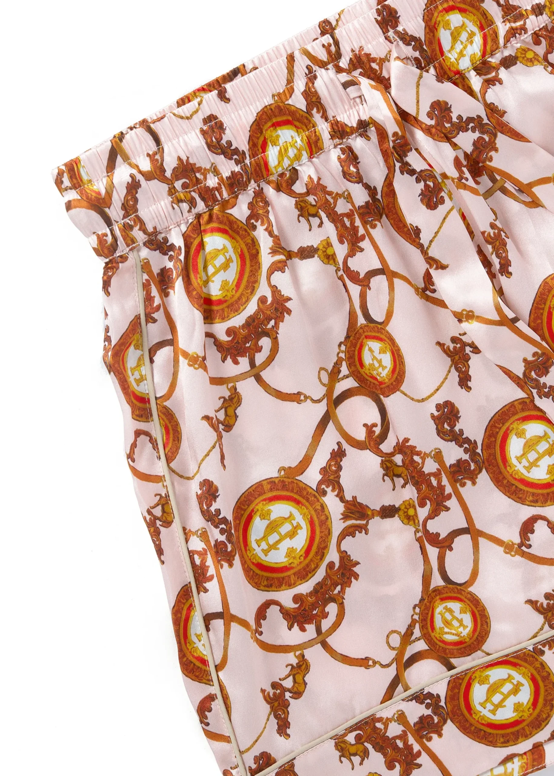 Made from our hand-drawn silk, with matching piping to the hem, our pyjama shorts have been designed with a loose fit. With a self tie waistband with subtle back pockets, these shorts are perfect for making your sleepwear feel truly luxurious. Pair with our pyjama tops and accessories to complete the look.