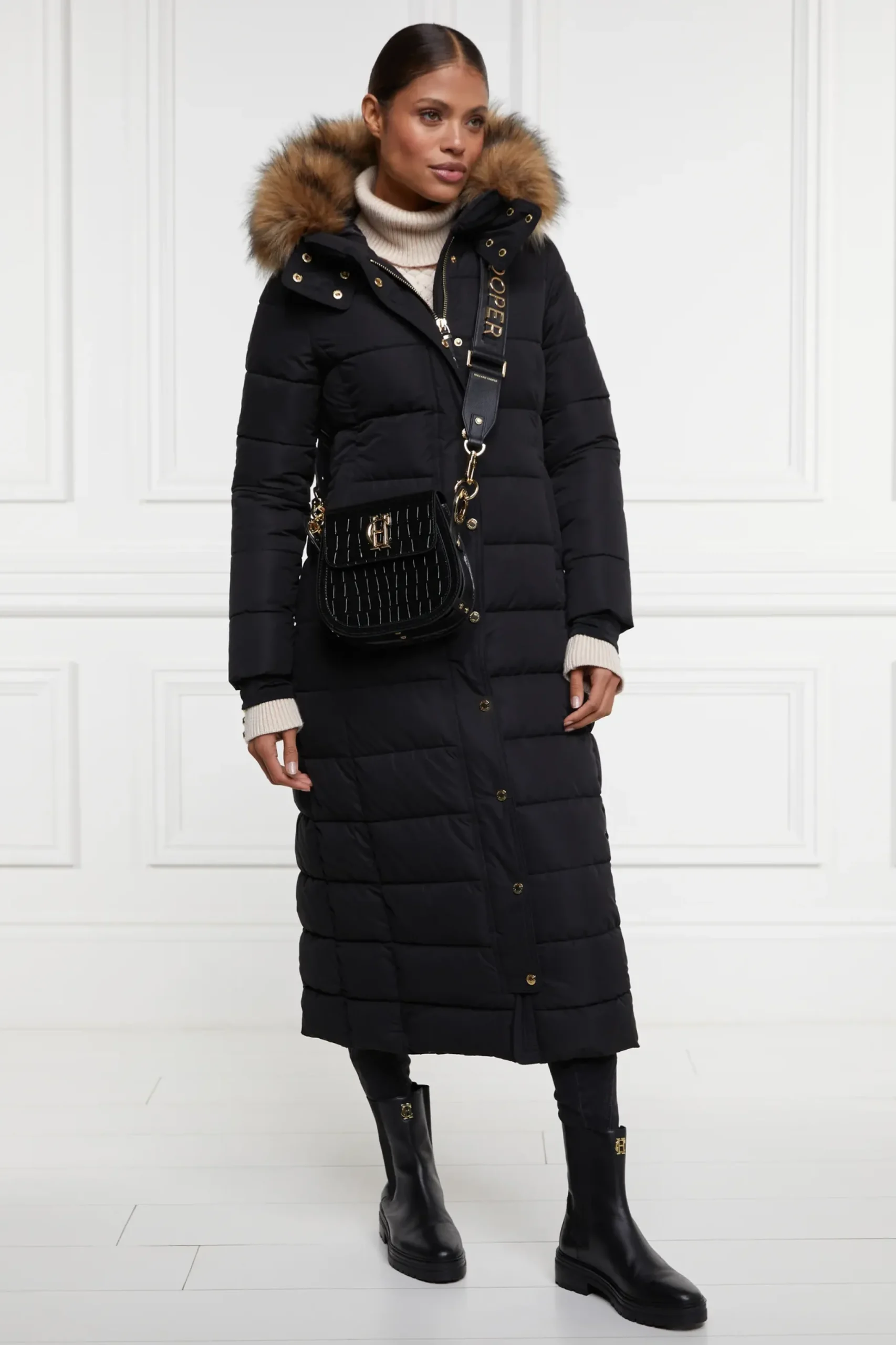 Designed with a longline silhouette and slim fit, the Stoneleigh Longline Coat has been meticulously crafted to ensure style, warmth and practicality. With a detachable faux fur hood collar, neoprene storm cuffs and eco-fill, this piece is ideal for chilly winter days whilst ensuring you still look put together. Finished with our iconic HC hardware and tonal embroidery.