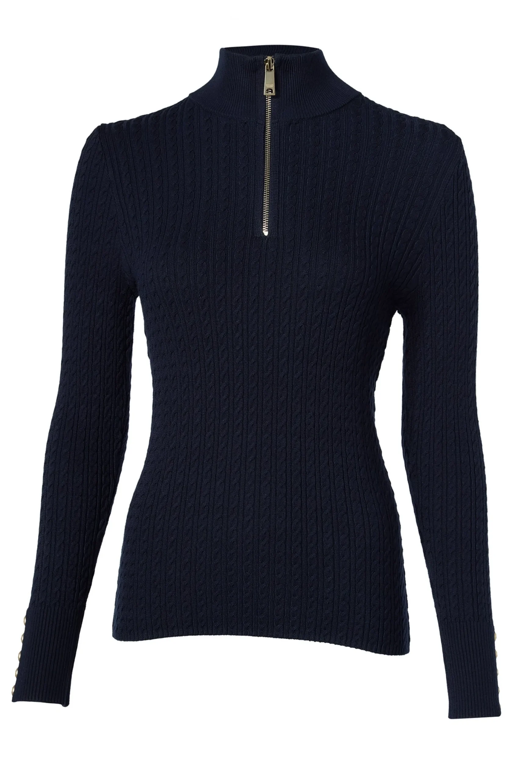 Crafted from a luxurious super soft yarn, this jumper ensures a sumptuously cosy feel against your skin. With an intricate cable design with a slim silhouette, the monogrammed henley zip offers versatility in styling. Beautifully elevated with gold hardware on the cuffs.