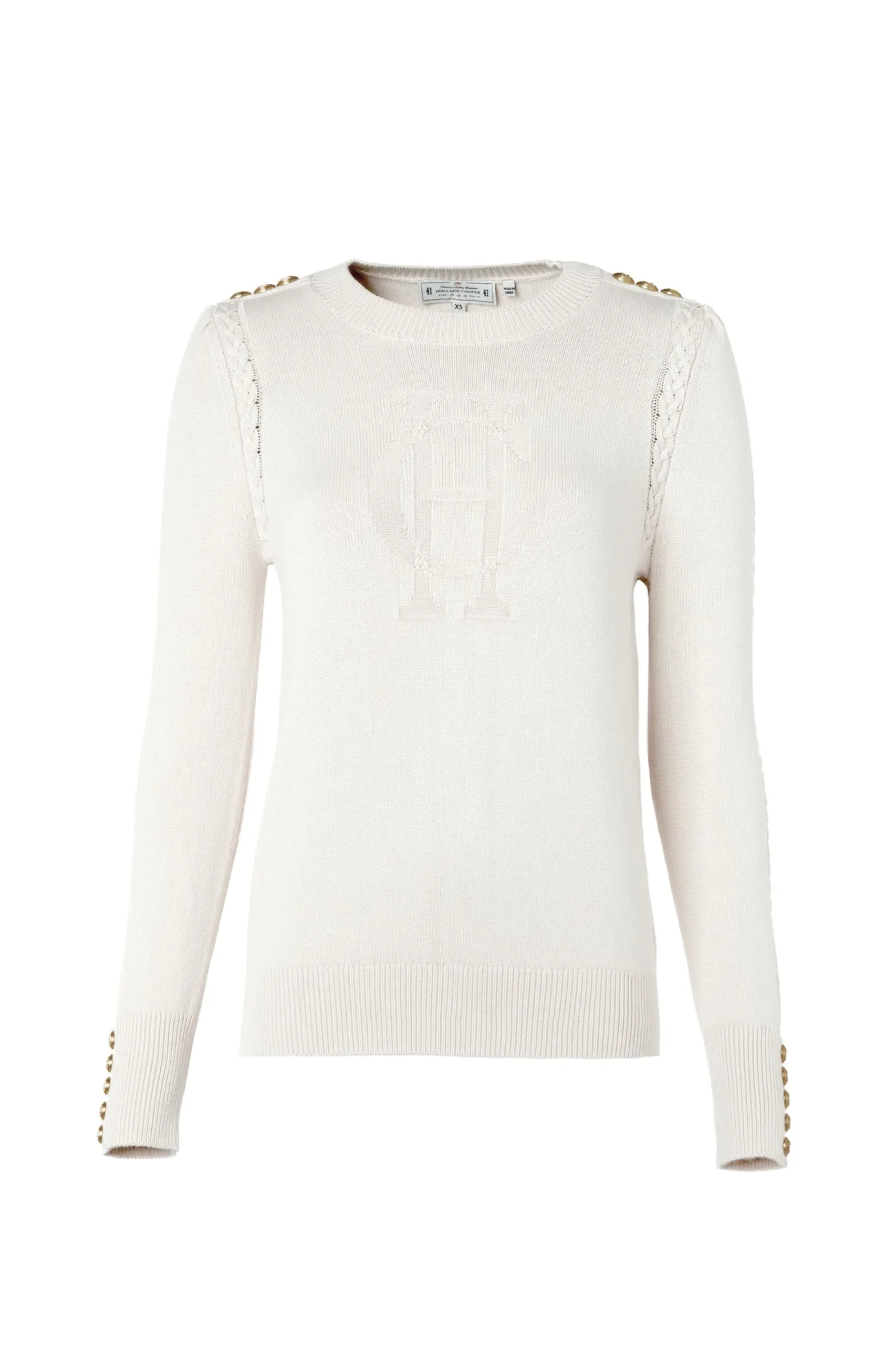 Crafted from a sumptuously soft yarn, this jumper boasts an intricate intarsia HC motif and cable pattern on the chest. Designed with a relaxed fit crew neck and slim sleeves, this piece ensures a comfortable and laid-back feel. Accentuated with our iconic gold hardware on the shoulders and cuffs.