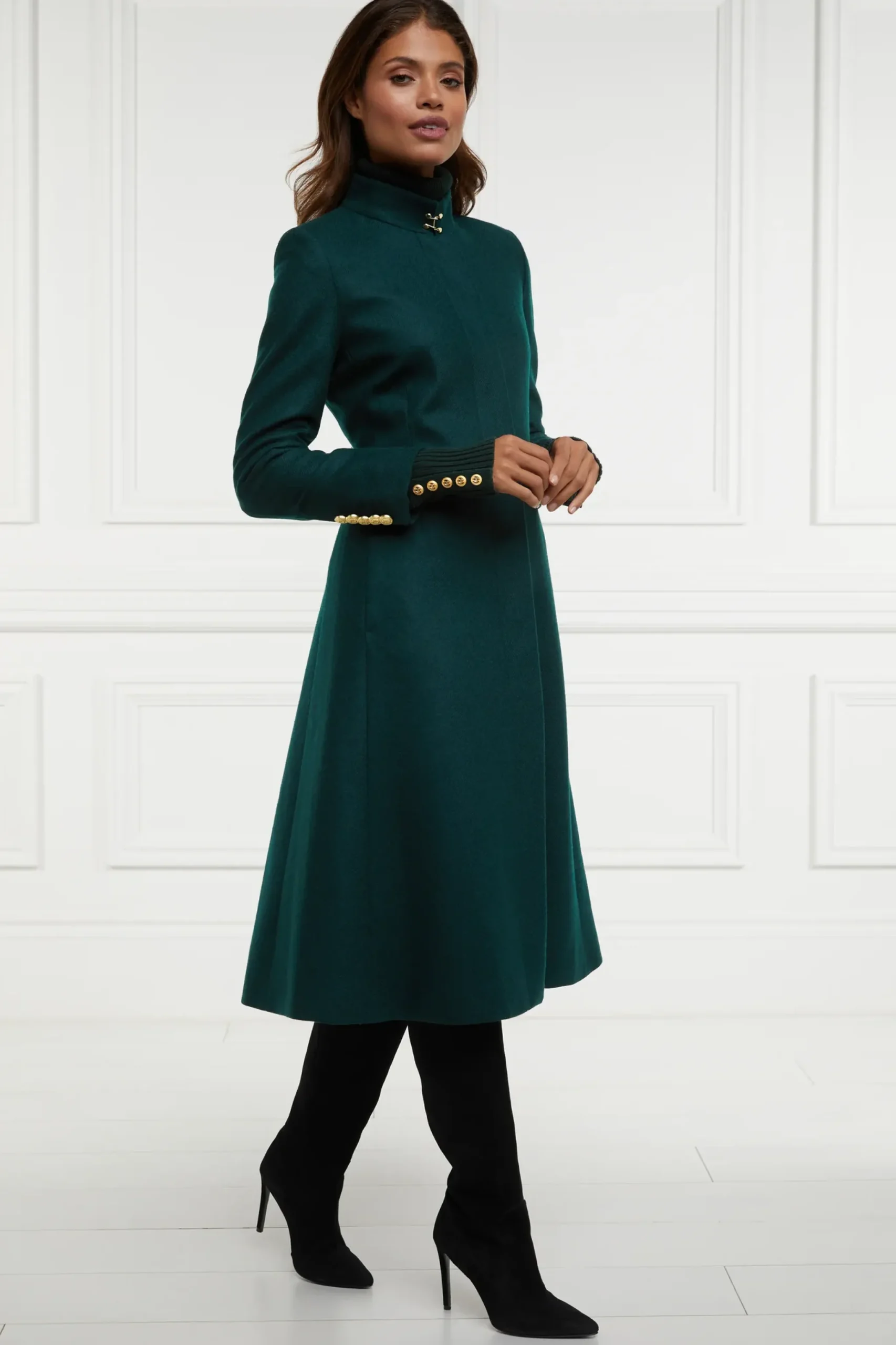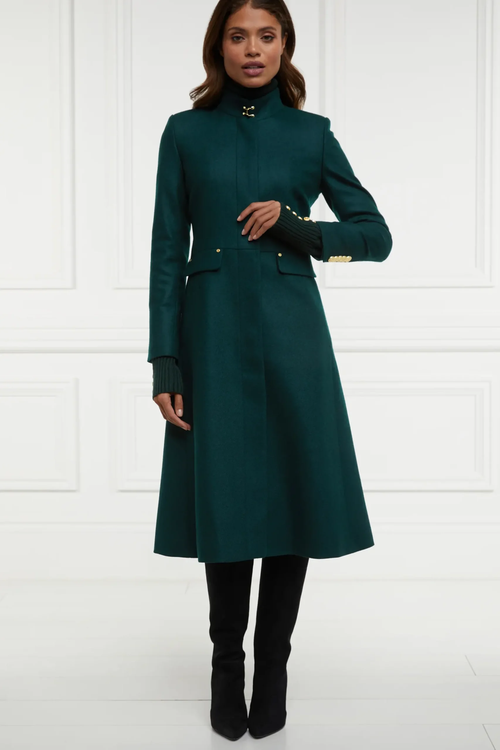 Perfectly capturing understated elegance, the Dowdeswell Coat offers a tailored silhouette with an exceptional fit and flare shape. Designed with clean lines, the elegant fitted back has been beautifully centred around a decorative HC back buckle. With dual entry lower pockets, this piece has been detailed with a high neck hook and eye closure and finished throughout with our signature gold hardware.