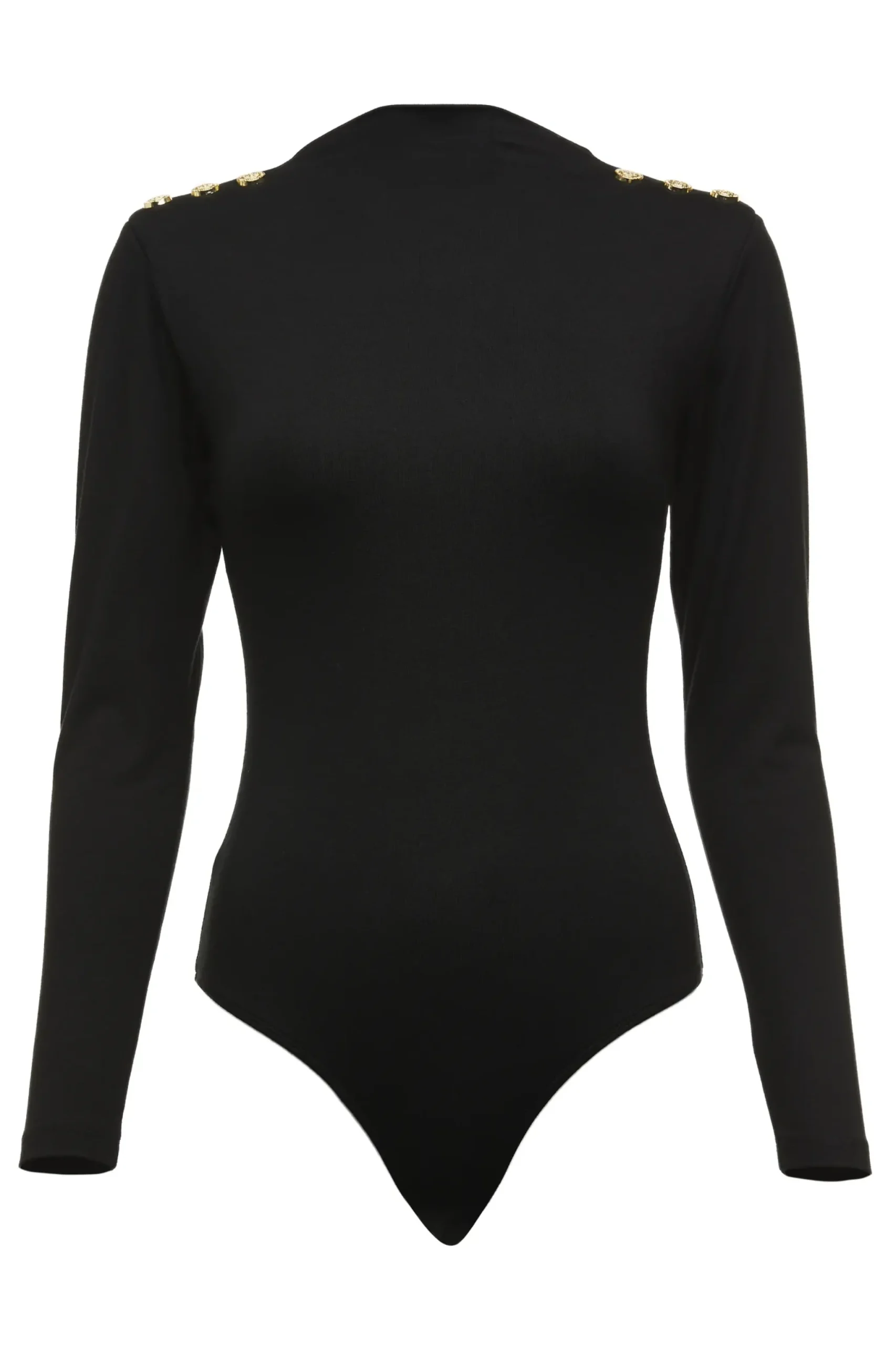 This long sleeve bodysuit is a timeless classic. It gives you a sculpted tucked in look with a high neckline and light padding on the shoulder featuring our signature HC gold hardware. Designed with a second skin feel, this soft stretch bodysuit has a flattering thong brief that will remain undetectable beneath close fitting tailoring or skirts.