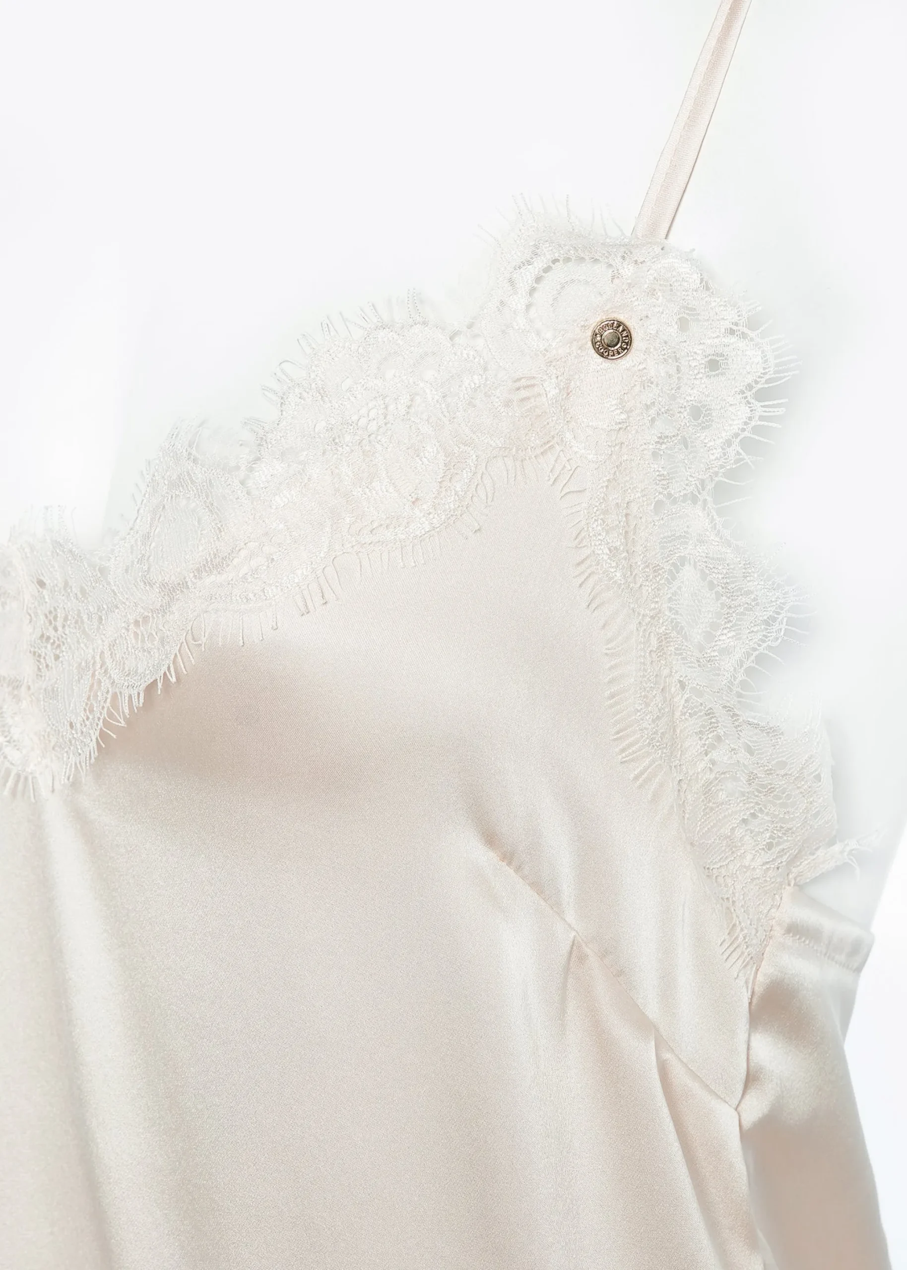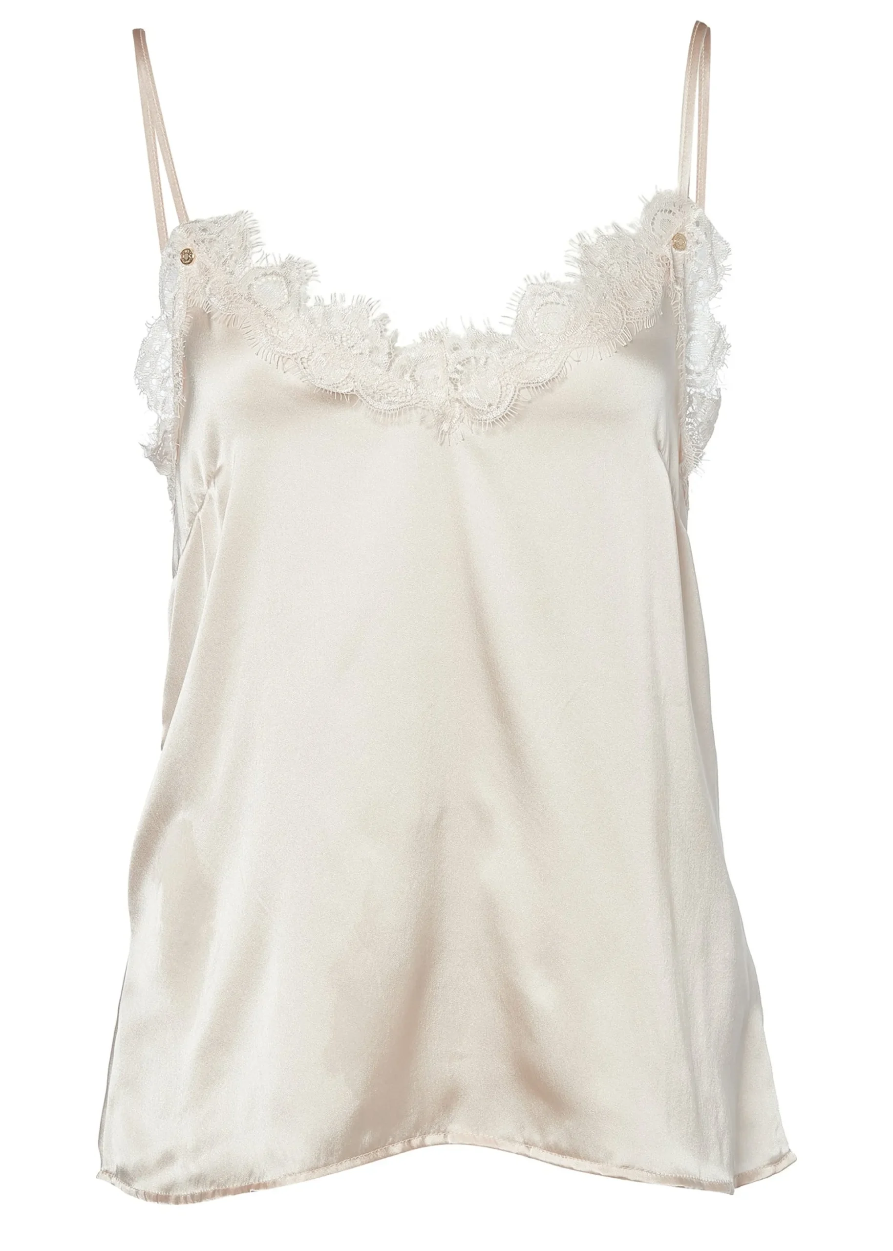 A beautifully luxurious v-neck cami with delicate lace trim to the neckline with adjustable spaghetti straps. Detailed with our HC engraved buttons.