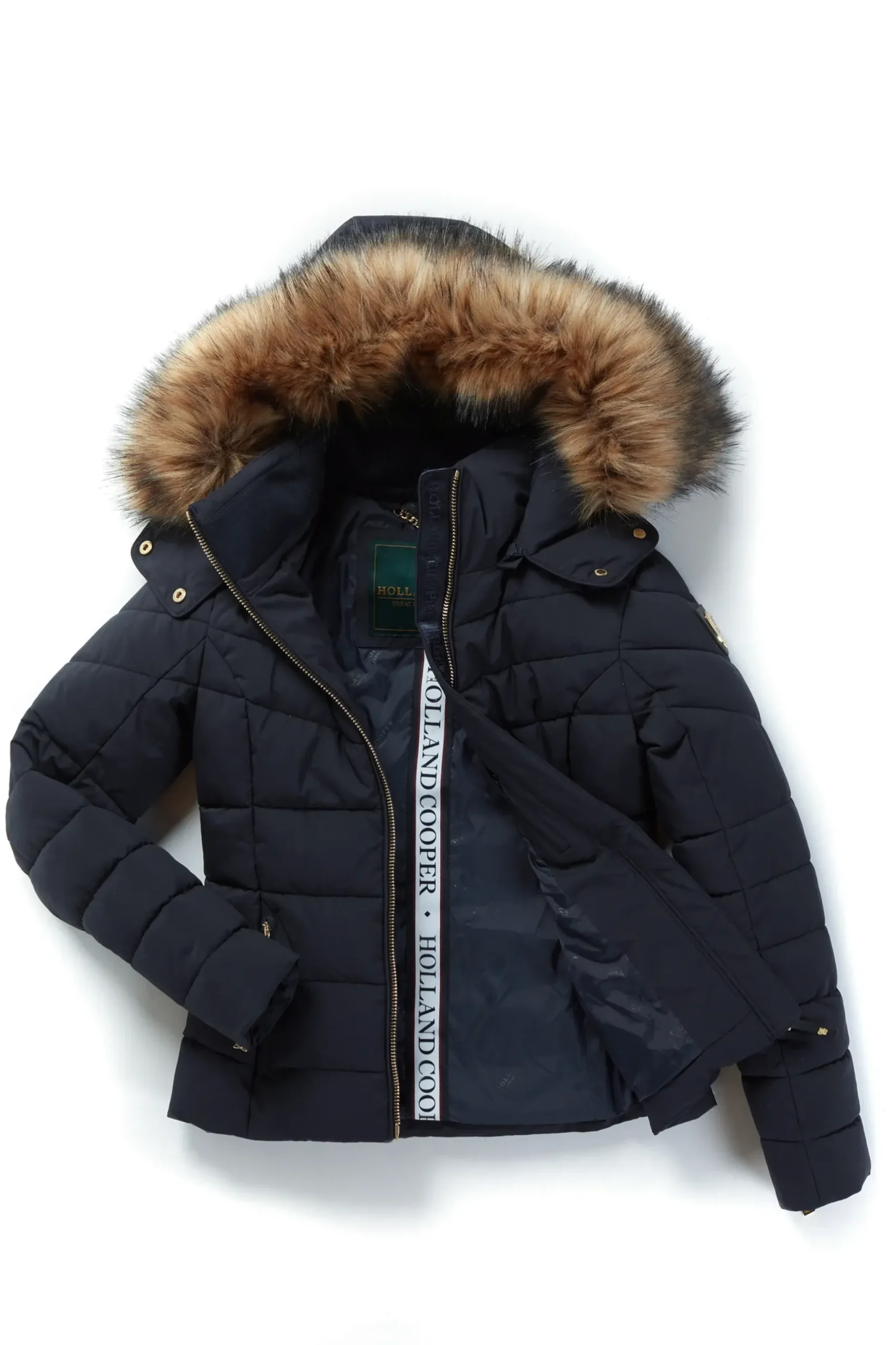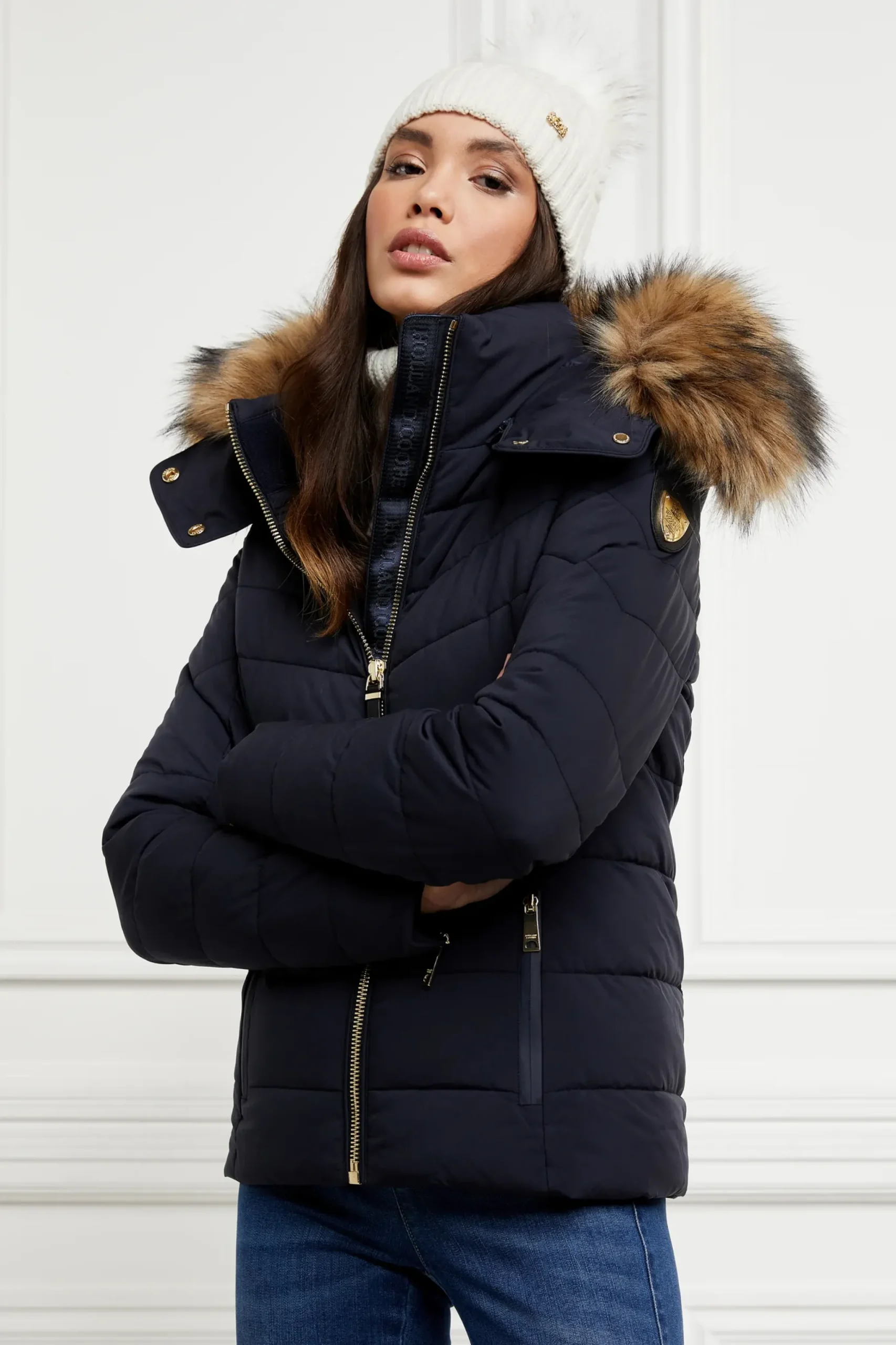 Designed with chevron quilting and neoprene storm cuffs, our Whistler Puffer is both practical and stylish. Curated and filled with an eco Sorona fill, this piece is both insulating and sustainable. With a HC patterned lining and coated exterior zips, this piece has been elegantly detailed with our iconic hardware. Beautifully finished with a detachable luxury faux fur-trimmed hood.